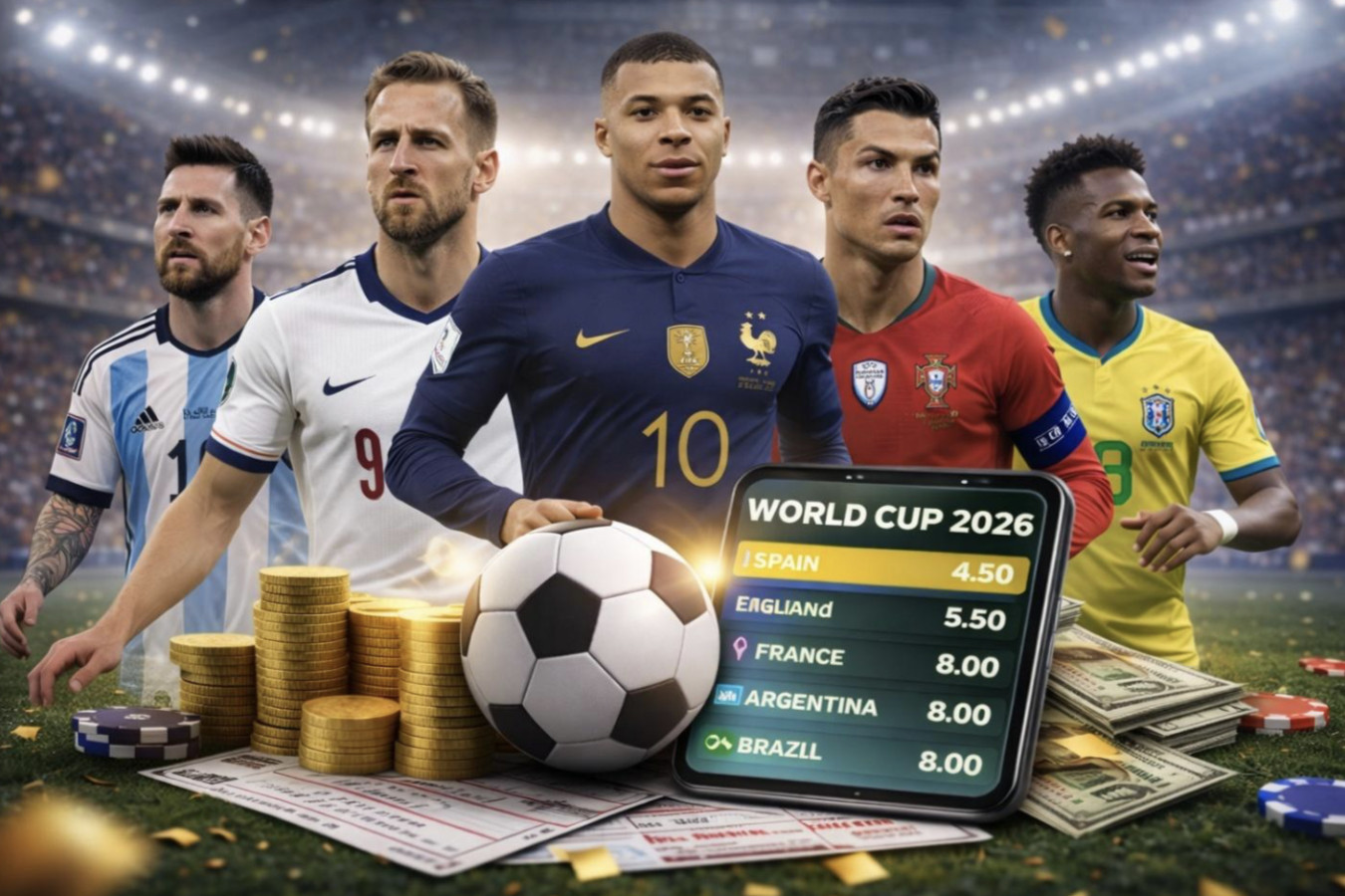 Śledzenie faworytów w zakładach bukmacherskich na Mistrzostwa Świata FIFA 2026 oznacza konieczność nadążania za ciągle zmieniającym się sytuacją – kontuzje, wiadomości dotyczące składu drużyn i losowanie grup wpływają na zmiany stawek – jednak obecna sytuacja wygląda mniej więcej tak: