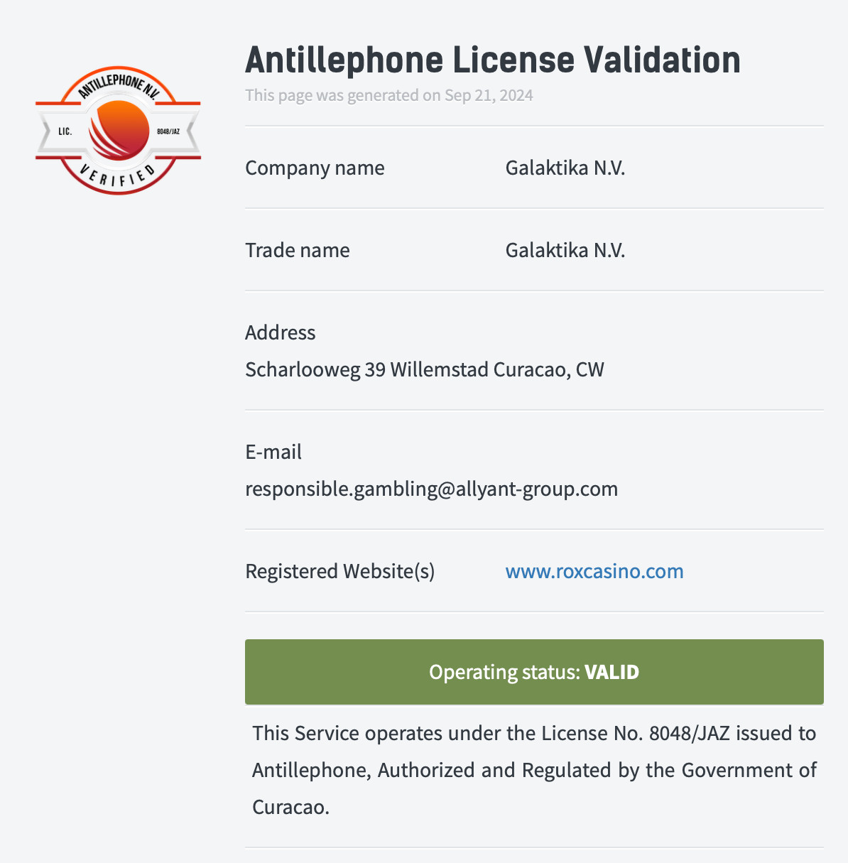 ROX kasyno oferuje graczom bezpieczne i kontrolowane środowisko gry, ponieważ jest licencjonowane na Curaçao. Operator strony, GALAKTIKA NV, jest źródłem informacji na stronie internetowej. Jest w pełni licencjonowany i regulowany przez prawo Curaçao i Antillephone NV (numer licencji: 8048/JAZ2016-050; ważny do 1 listopada 2024 r.).